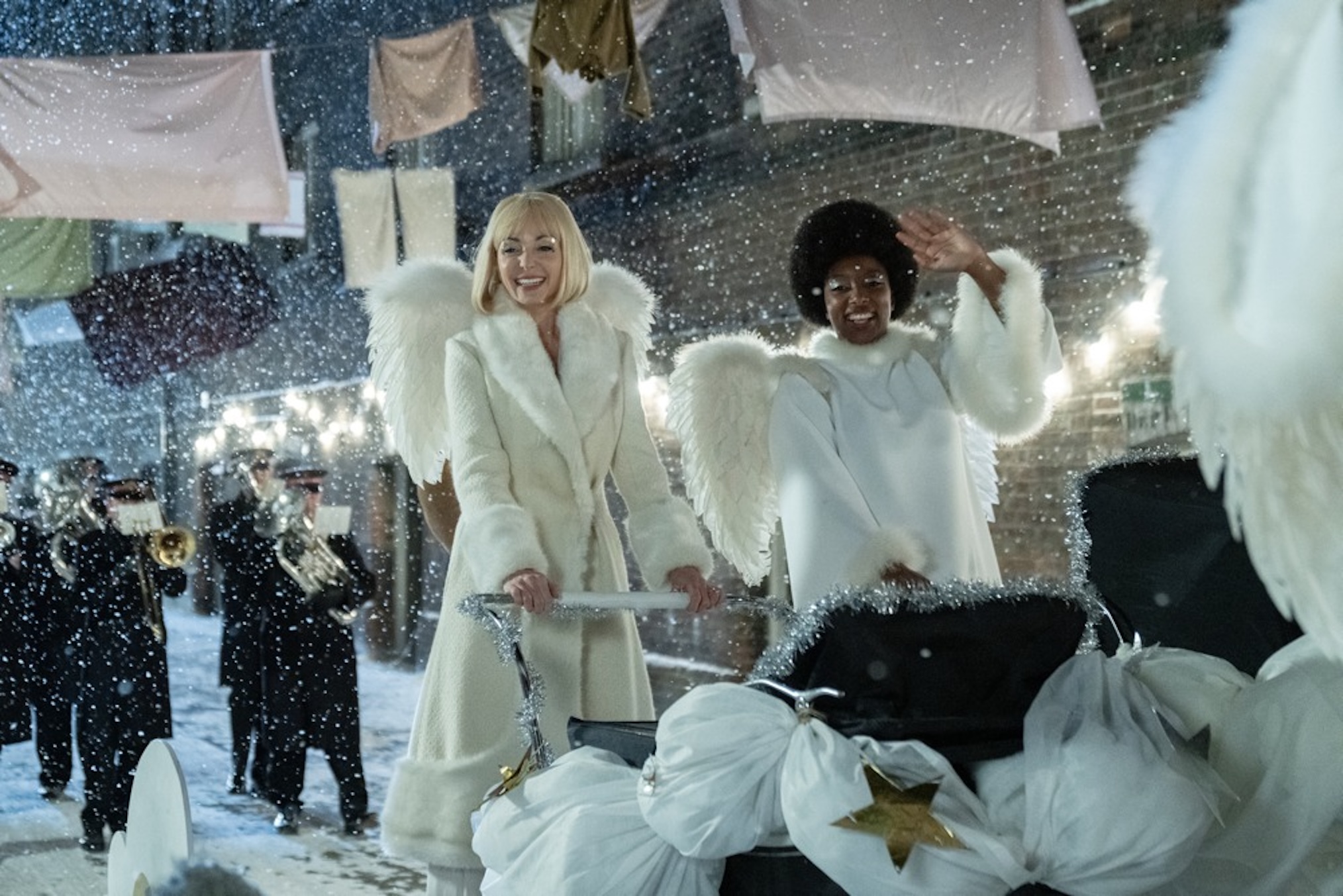 “I get to take part in a Christmas parade where we travel along on a very Christmassy-looking van with these incredible costumes. I wear an angel costume,” said Helen George, who plays Trixie Franklin. “It’s probably the favourite costume I’ve ever worn. It’s got a 1970s twist. It’s a beautiful white coat with a fur trim and angel wings coming out of the back, and then these really cool glittery stars. For me, it was a lot of fun dressing up. This is probably one of the most Christmassy Christmas specials we’ve ever done!”