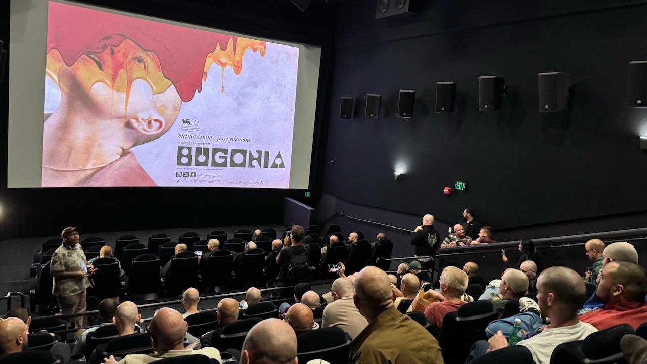 Snuck into the hottest screening in LA… the all-bald screening of Bugonia: https://t.co/QFctMdEUnb pic.twitter.com/hY4C7aEtaV
